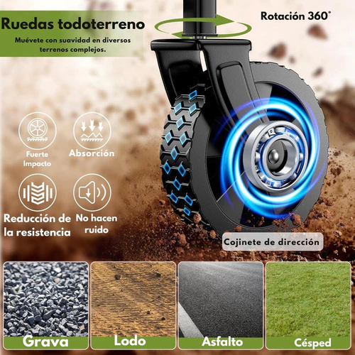 🛞 Ruedas y Movilidad: Rodamientos integrados para un rodaje suave, apto para diversas superficies como barro, hierba y bordillos.