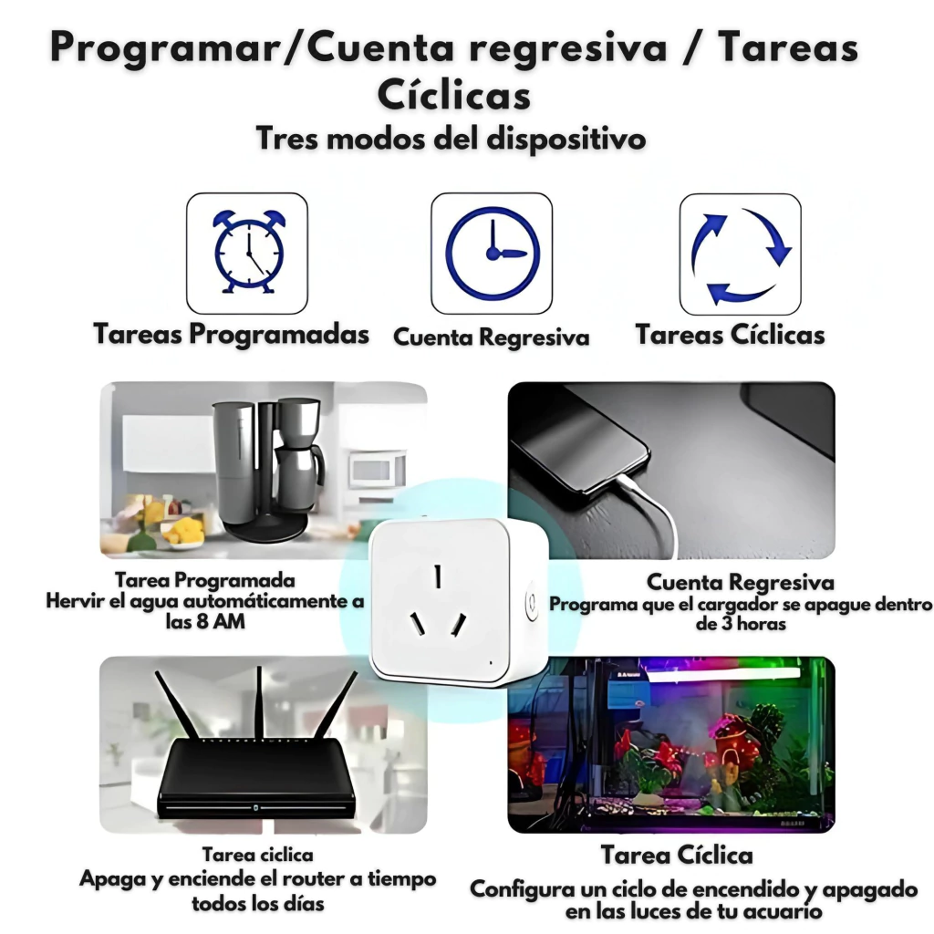 ⏱️ Temporizador y Programación: Incluye modos de tiempo, cuenta regresiva y horario para automatizar tus dispositivos según tus rutinas diarias.
