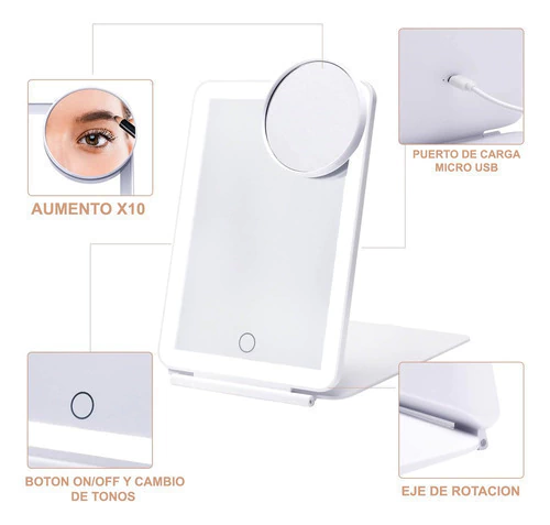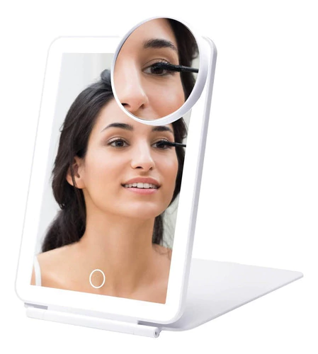 Lleva tu rutina de belleza a cualquier lugar con este espejo de maquillaje portátil con luz LED y aumento x10. Ideal para viajes, oficina, hoteles o el hogar, combina practicidad, estilo y funcionalidad.