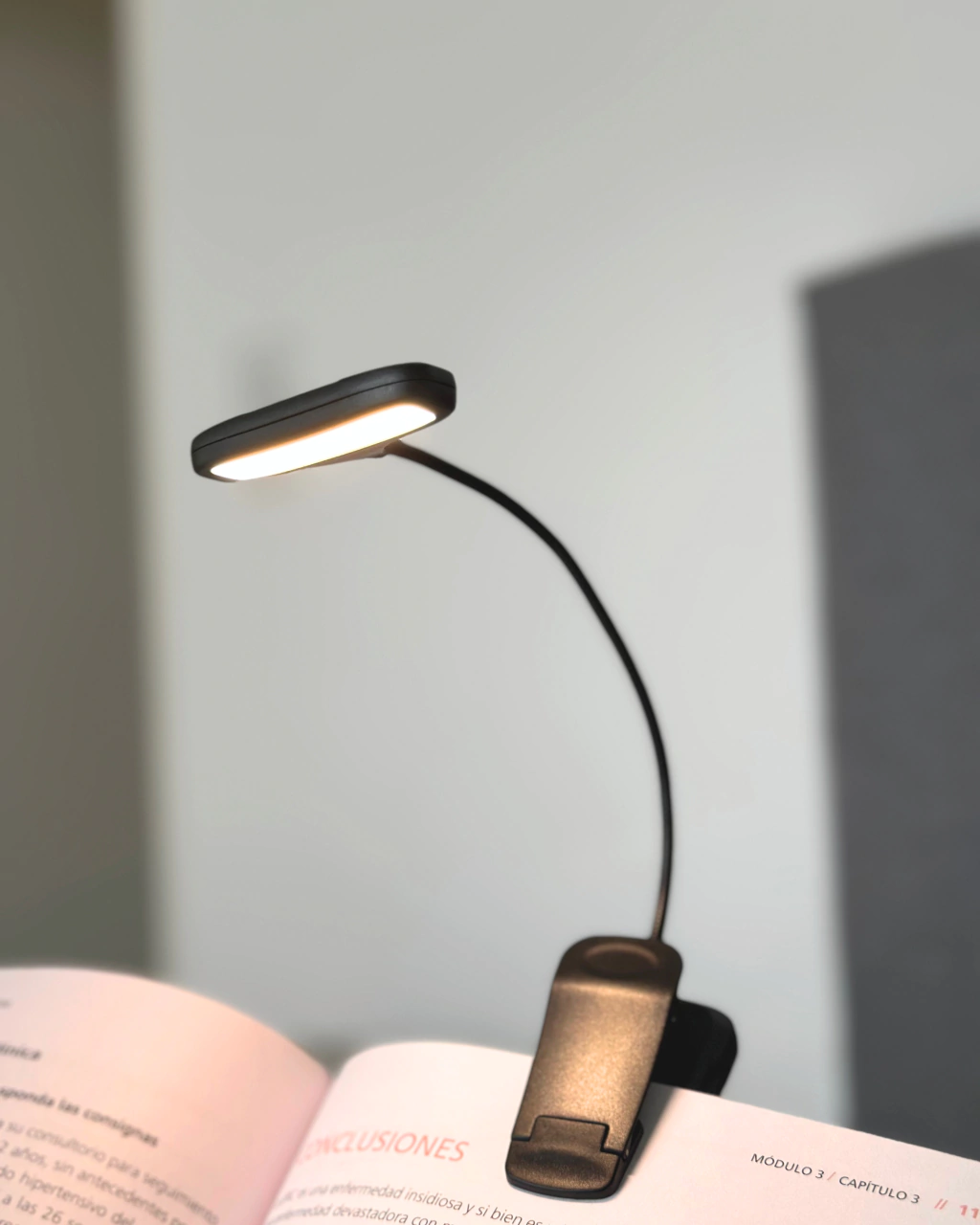 🌀 Cuello flexible 360° y clip seguro – el cuello de silicona permite girar y plegar la luz a cualquier ángulo; clips con almohadillas antideslizantes para sujetar de forma firme libros, lectores electrónicos, estantes y más.
