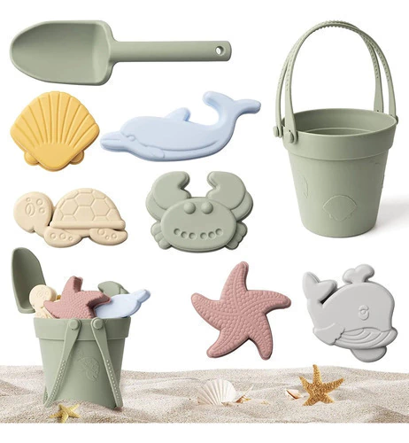 Divertite y explorá la creatividad de los más chicos con este set de juguetes de playa de silicona. Incluye un balde, una pala y seis moldes de criaturas marinas como estrellas de mar, delfines, ballenas y cangrejos (color aleatorio).