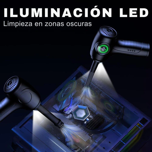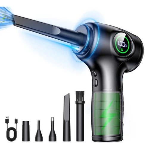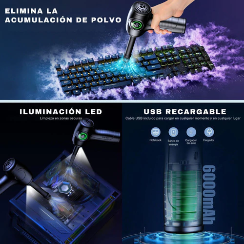 Mantén tus dispositivos y espacios libres de polvo con este soplador de aire portátil, potente, recargable y versátil. Ideal para equipos electrónicos, automóviles y tareas domésticas.