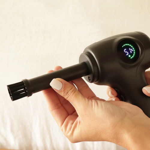 Batería de 2000 mAh × 3 con hasta 35 minutos de uso en modo bajo. Tiempo de carga rápida de 3-4 horas con potencia máxima de 80 W, ofreciendo una alternativa más ecológica y duradera que las latas de aire comprimido tradicionales.