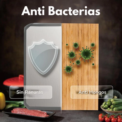 ✨ Resistente a Arañazos: La superficie de acero inoxidable dispersa la presión del cuchillo, evitando marcas profundas y manteniendo la tabla impecable por más tiempo.